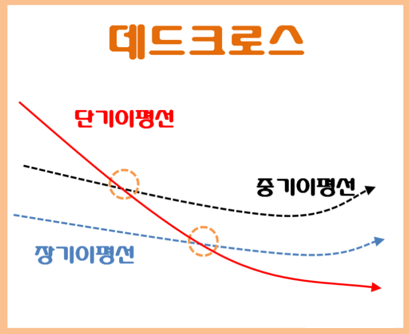 2번 데드 크로스는 단기이평선이 중장기 이평선을 위에서 아래서 뚫으면서 역배열로 들고 하락하는 모습입니다