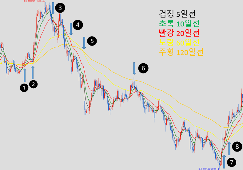 기본적으로 이평선은 5일선, 10일선, 20일선, 60일선, 120일선을 사용한다