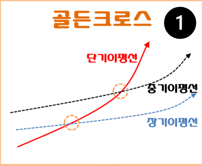 1번 골든크로스는 단기이평선이 중장기 이평선을 아래서 위로 뚫으면서 정배열로 만들고 상승하는 모습입니다