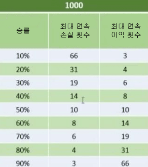 아래 표는 승률에 따라 트레이더가 반드시 겪게 될 연속 손실 횟수를 정리해놨다.