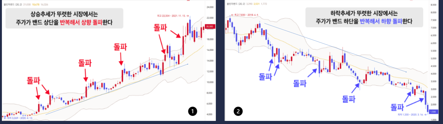 - 일시적인 밴드 돌파가 발생할 수 있으므로, 거래량과 다른 보조지표를 함께 확인해야 함