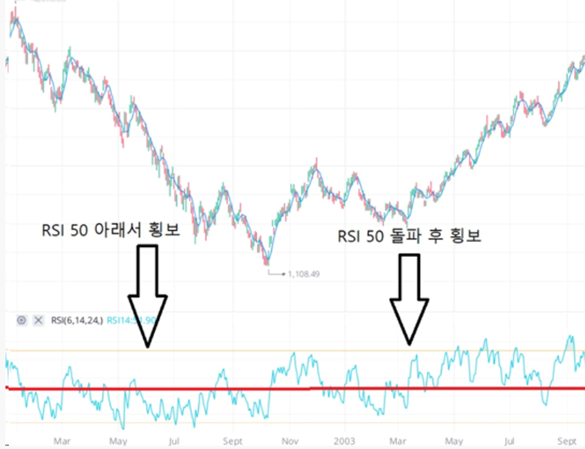 대체적으로 캔들이 우하향하는 시점에는 RSI가 50 아래서 횡보하고, 우상향 하는 시점에서는 RSI가 50 위에서 횡보하는 모습을 보입니다.