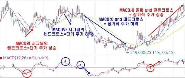② MACD가 시그널을 상향돌파(골든크로스)하면 매수, 하향돌파(데드크로스)하면 매도
