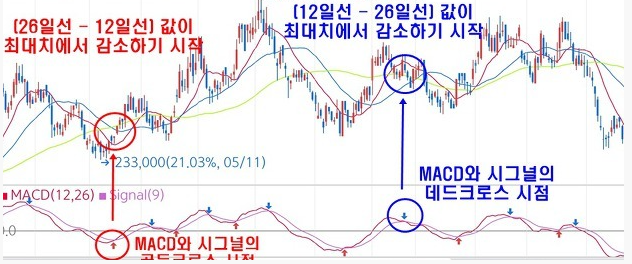 ④ MACD와 시그널이 데드크로스 (26일선-12일선) 값이 최대폭인 지점